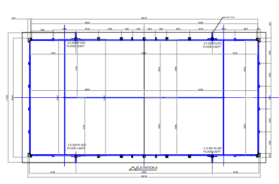 يبلغ طول الملعب 20 متراً وعرضه 10 أمتار وجدرانه الخلفية مصنوعة من الزجاج بارتفاع 3 أمتار. الجدران الجانبية الزجاجية مصنوعة من زجاج بارتفاع 4 أمتار. أما باقي الملعب فهو مصنوع من شبكة حديدية يصل ارتفاعها إلى 4 أمتار.